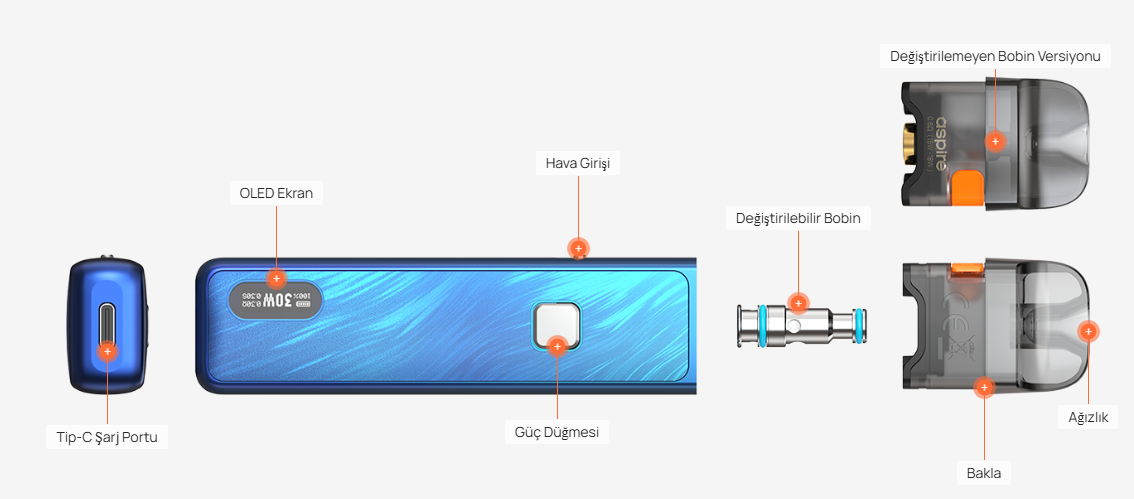 • Değiştirilebilir ve değiştirilemez coil seçenekleri ile farklı buhar deneyimleri.
