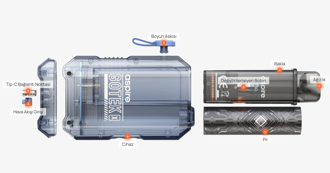 Aspire Gotek X, on farklı şeffaf tasarımla sunulmakta ve kolay taşıma için akıllı bir boyun askısı klipsi ile birlikte gelmektedir. Bu, cihazın taşınmasını son derece kolay hale getirir ve şarj gerektiğinde USB-C bağlantı noktası sayesinde hızlı bir şekilde şarj edilebilir.