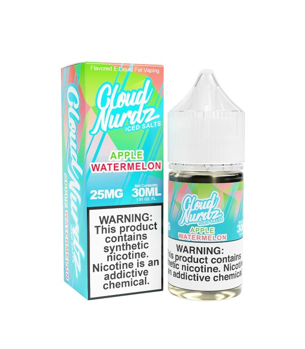 Cloud Nurdz Apple Watermelon Iced Salt Likit, taze yeşil elma ve tatlı karpuz aromalarını buz ferahlığıyla birleştirir. 30 mL, 25 mg / 50 mg nikotin seçenekleri, 60VG/40PG oranı.