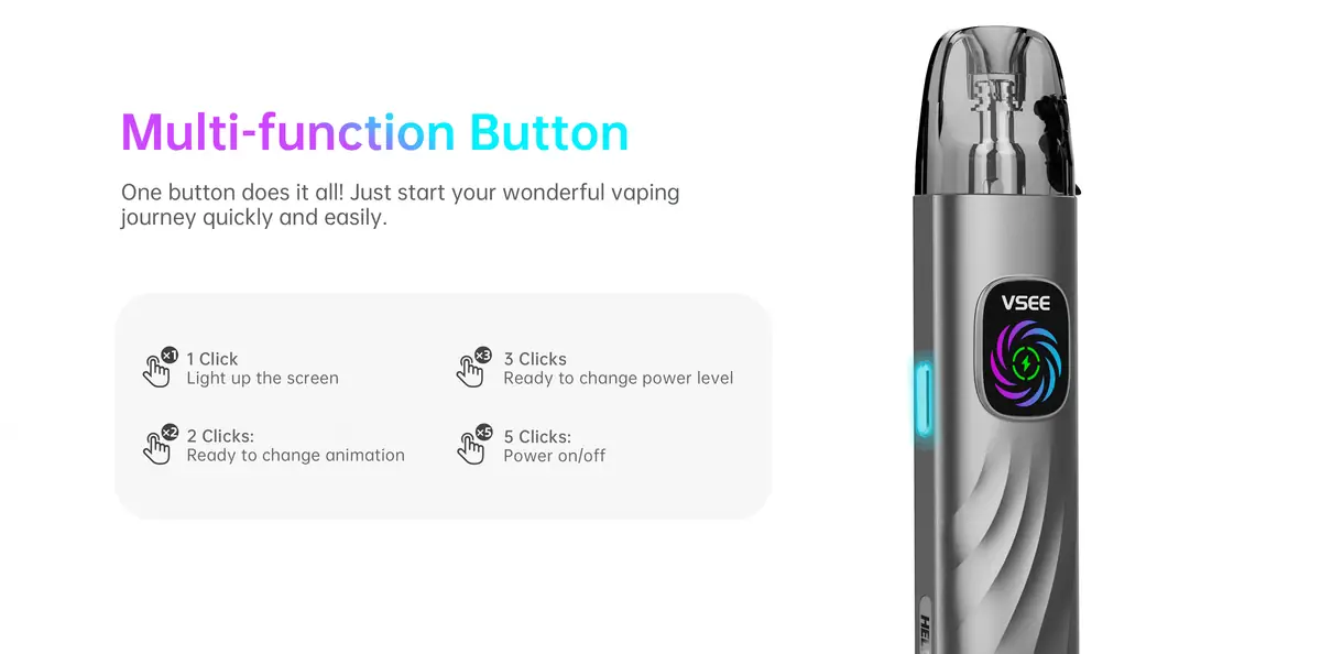 Hellvape VSEE One Pod Kit, 1000mAh batarya, 30W maksimum çıkış gücü ve 4 kademeli güç seçeneğiyle hem aroma hem buhar isteyen kullanıcılar için ideal bir cihazdır. 2ml likit kapasitesi, yan dolum sistemi, USB-C hızlı şarj ve ayarlanabilir hava akışı gibi özelliklerle kullanım kolaylığı sağlar. Kompakt ve tarz sahibi renk seçenekleriyle öne çıkar.