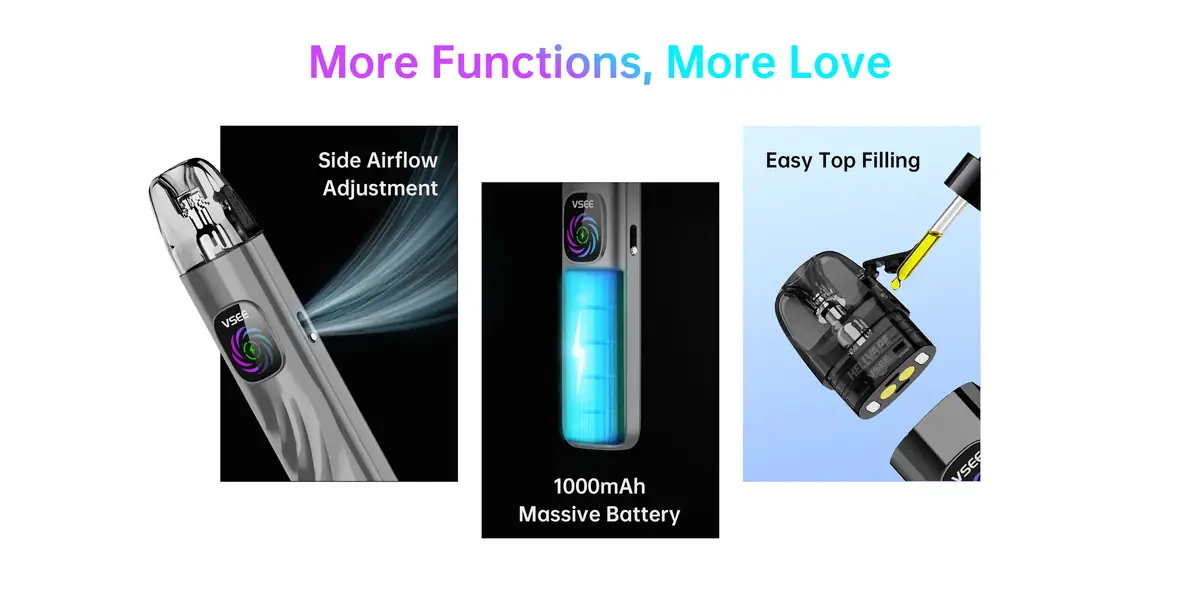 • Side-fill (yan dolum) pod kartuş sistemi — likit doldurma işlemi pratik ve temizdir.