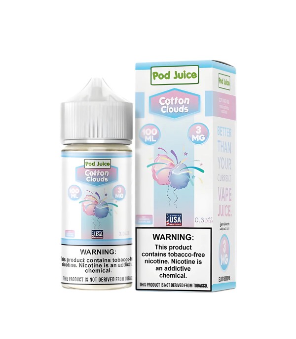 Pod Juice Cotton Clouds, pamuk şekerinin tatlı ve hafif aromasını yansıtan yumuşak, nostaljik bir elektronik sigara likitidir. 70VG / 30PG oranı sayesinde yoğun buhar ve dengeli aroma deneyimi sunar. 100 mL şişede; 0 mg, 3 mg ve 6 mg nikotin seçenekleriyle üretilmiştir.