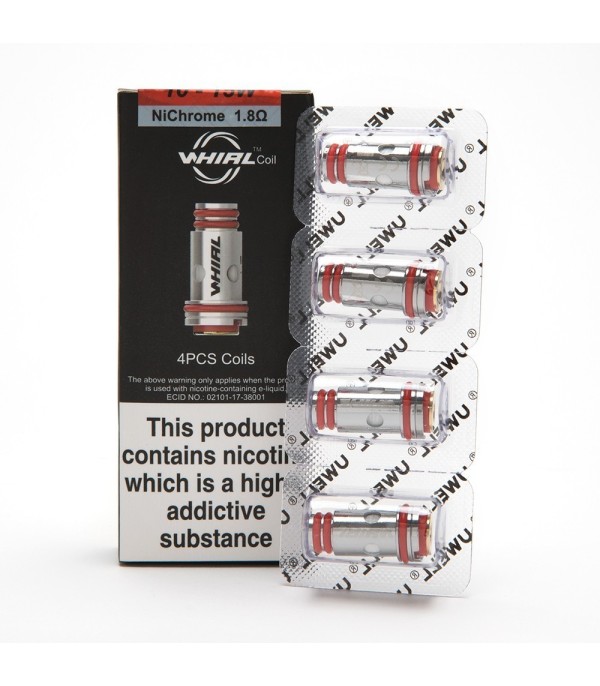Uwell Whirl tankına veya Whirl 20 AIO kitine sığacak şekilde 4 Uwell Whirl Coil paketi. İki tip bobin vardır: 18 ile 22W arasında çalışan 0,6 Ohm veya 10 ile 15W arasında çalışan 1,8 Ohm bobin.